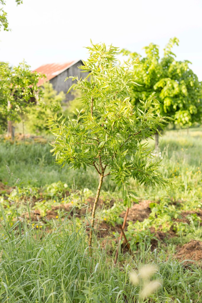 L’objectif du jardin-forêt est de prendre de la hauteur pour étager les cultures et bénéficier de l’ingéniosité écosystémique des arbres, la plupart des arbres déjà présents ont donc été conservés, identifiés, taillés et paillés. Ils apportent ainsi ombre et fraîcheur, coupent le vent, font remonter l’humidité du sol à la surface ainsi que de nombreux nutriments, peuvent servir de support à nos lianes fruitières et nous offrent de belles récoltes surprises ! (pêches, Reine-Claude, pommes, poires, griottes)