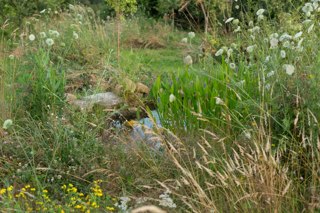 Une mare de 9 m2 a été creusée dans les respect des principes de la mare naturelle (cf. « mes pratiques« ), et est alimentée avec de l’eau de pluie.